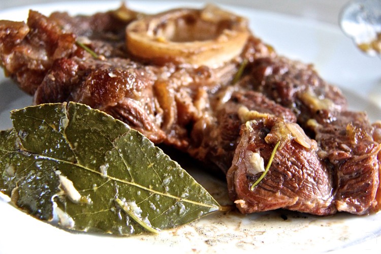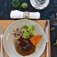 In einem schweren Emaille-Topf mit etwas Butter von beiden Seiten scharf anbraten, herausnehmen und dann darin die Zwiebel, die Karotte und den Sellerie kurz andünsten. Eine Brise Zucker dazu und mit dem Rotwein ablöschen. 2 Minuten köcheln lassen und dann mit der Brühe aufgießen. Die restlichen Kräuter und Gewürze…