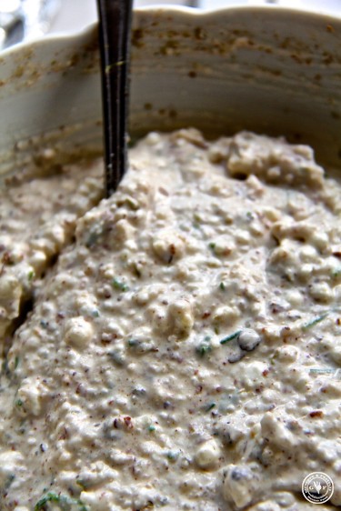 Wir nehmen eine weitere Schüssel und geben 100g Hüttenkäse, 100 ml Soja-Sahne, 4 EL Nussatome, etwas Salz und Pfeffer, 1 EL Oregano, 3 EL geriebenen Parmesan, frisch geriebene Muskatnuss, eine Brise Zucker und 1 EL geschnittenen Schnittlaub hinein und mischen alles gut durch. Der Hüttenkäse und die Soya-Sahne sind erstens Low Carb und zweitens haben sie deutlich weniger Kalorien! Und wenn es doch ein schwäbisches Bio-Festmahl werden soll, dann kann man ja vielleicht auch mal ein paar Kalorien weglassen.