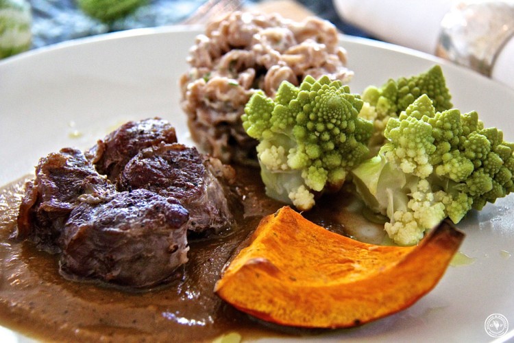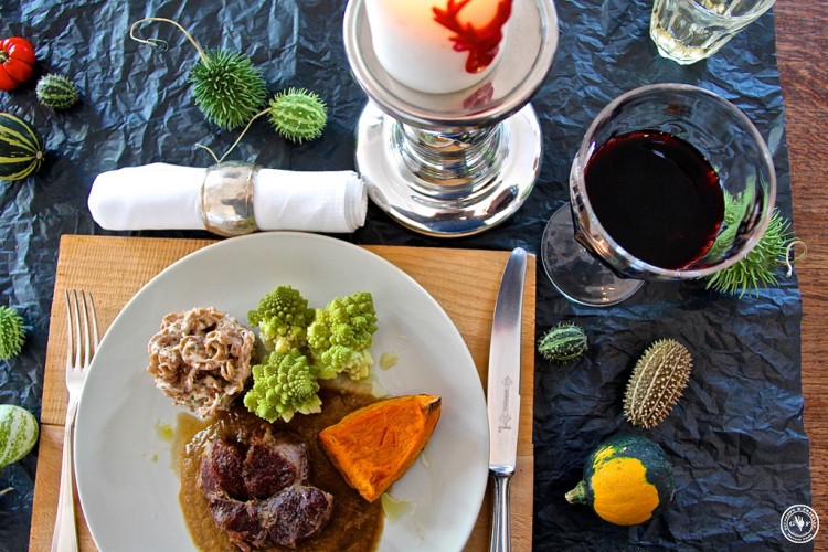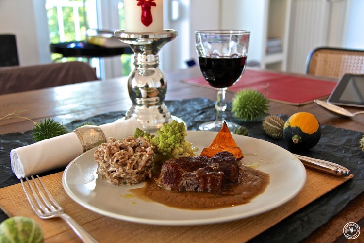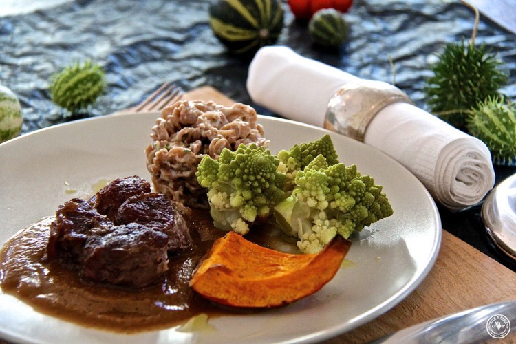 Geschmorte Rinder-Beinscheibe mit Zwetschgen-Sauce, Emmer-Nudeln mit Nuss-Sauce, Kürbisspalte und Romanesco-Röschen