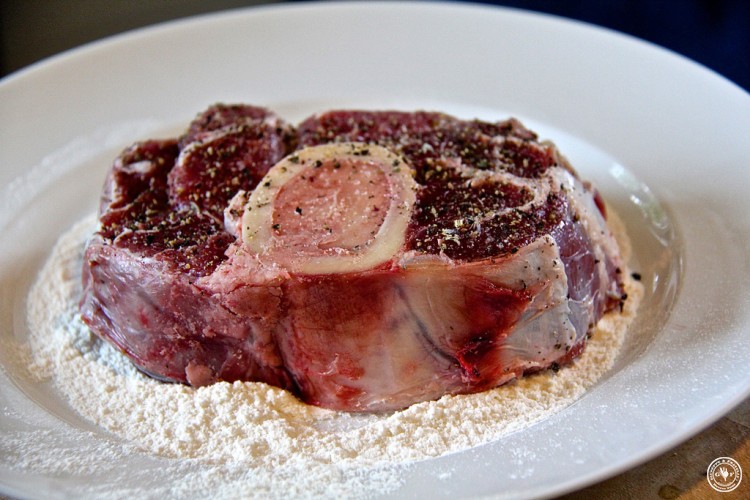 Wir haben eine Bio-Rinder-Beinsccheibe bekommen. Und ich muss wirklich sagen, das Bio-Rind schmeckt wirklich besser. Einfach eine Wucht. Die Beinscheibe salzen und pfeffern und in Mehl wenden.