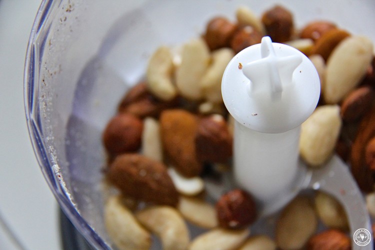 Die Emmer-Nudeln sich echte Sprinter, die nur wenige Minuten zum Garen benötigen (3-6 min laut Packungsangabe). Für die Nuss-Sauce werden die Nüsse (Nussmix: Mandeln, Macademia, Erdnuss, Cashew) im Blitzhacker atomisiert.