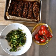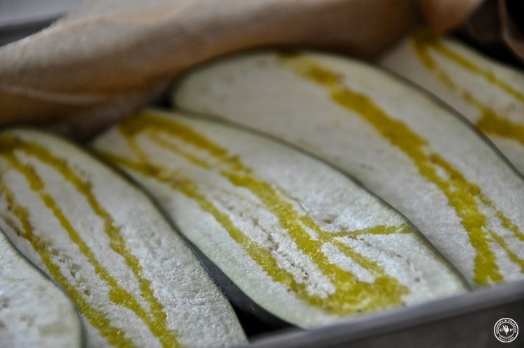 Wir beginnen mit den Auberginen. Waschen, halbieren und mit etwas Olivenöl und Salz bei 200 Grad 20 min in den Ofen geben.