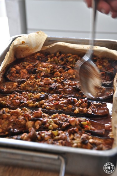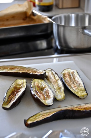 Jetzt können wir die Auberginen aus dem Ofen holen und kurz abkühlen lassen.