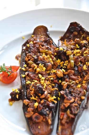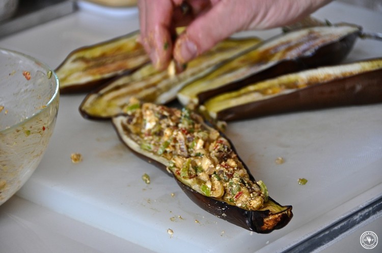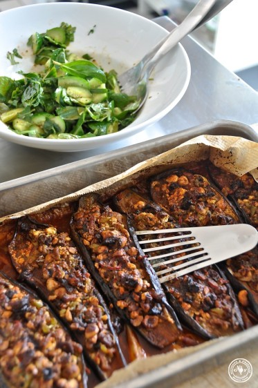 Überbackene Aubergine mit Haselnuss-Feta-Füllung und Gurken-Minzsalat