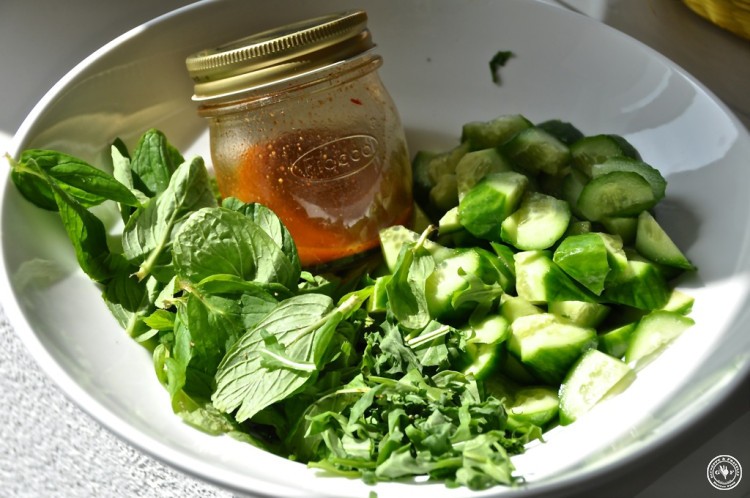 Das Dressing besteht aus 1 EL Olivenöl, 1 EL Walnussöl, 2 EL Apfelessig, 1 EL Tahini-Sauce (Sesam-Sauce), 1 TL Sesam-Samen, 1/2 TL gemahlenem Koriander, 1/4 TL Cilipulver und 1 TL Honig.