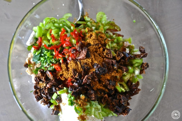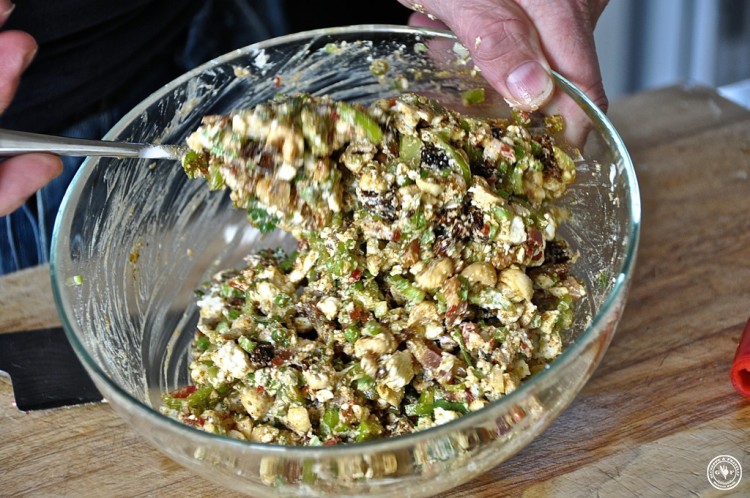 1/2 Packung Ziegenkäse (Feta), 1 EL saure Sahne, 1/2 Handvoll Haselnüsse leicht gehackt, die Stengel von 1 Bund Koriander, 1 guter TL Ras-el-Hanout, 1/2 gehackte Chili, 3 klein geschnittene, getrocknete Feigen, in kleine Streifen geschnittenen Speck, 2 EL Olivenöl, 1 geriebene Knoblauchzehe, 2 längliche, grüne Paprika, Salz/Pfeffer.