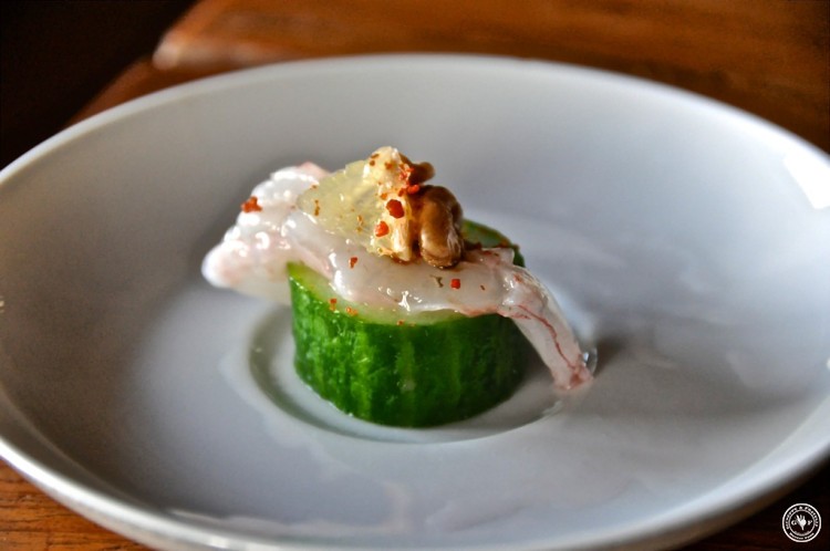 Gurke,  dunkle Sojasauce, rohe Garnele, Walnuss, Limetten-Filet, Chiliflocken!