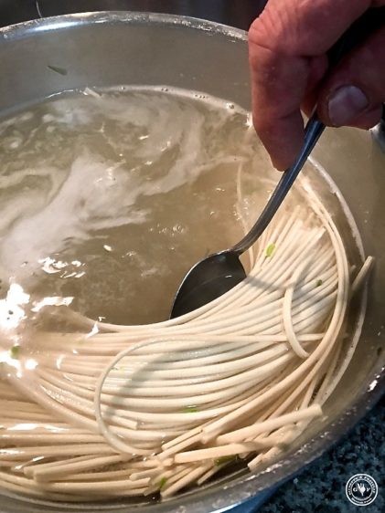 Jetzt die Udon-Nudeln nach Packungsangabe in leicht gesalzenem Kochwasser garen und kurz kalt abspülen, damit sie nicht weiterer garen und matschig werden. Das Nudelwasser aufbewahren für die Gemüseeinlage.