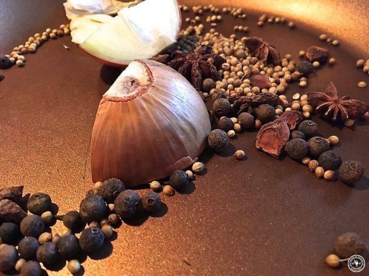 In einer Pfanne ohne Öl je 1 TL Koriandersamen, Pimentkörner, 3 Sternanis und eine halbierte Zwiebel mit Schale anrösten, bis sich die ätherischen Öl herauslösen und zu duften beginnen, dann alles ebenfalls zur Brühe geben.