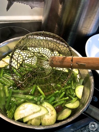 Kurz bevor die Suppe fertig ist, die Gemüseeinlage kurz im Nudelkochwasser blanchieren und herausnehmen.