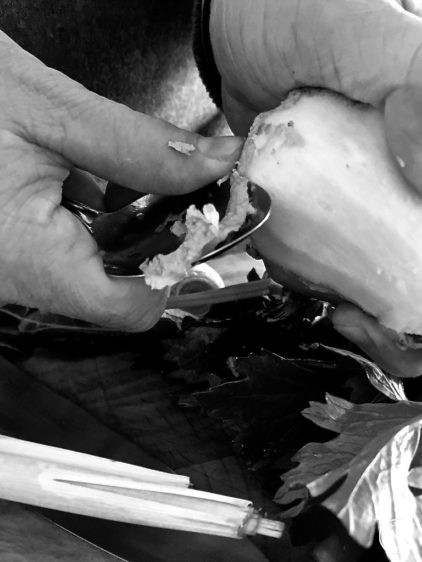 Übrigens ist es viel einfacher die Haut des Ingwers mit einem Löffel abzuschaben. Kinderleicht und viel effizienter als mit dem Messer.