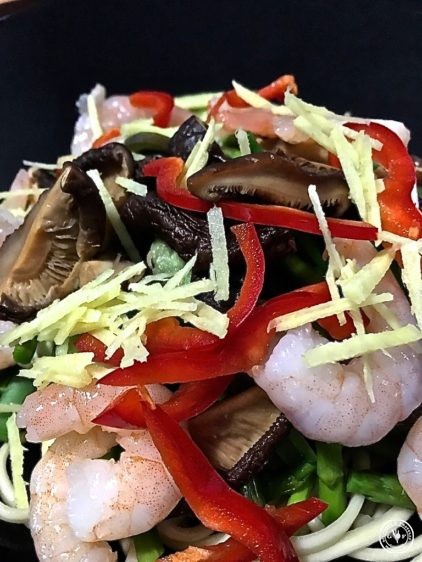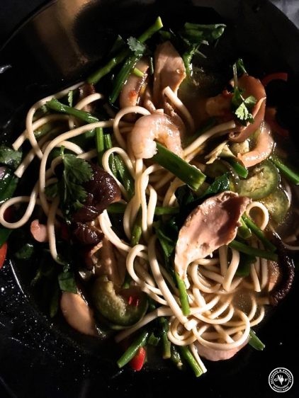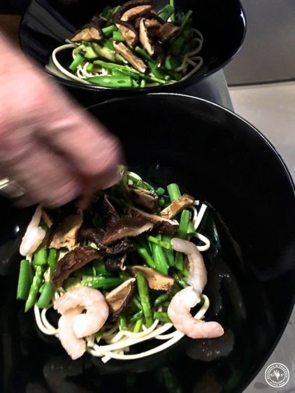 Die Brühe final abschmecken (Limettensaft, Salz, Fischsauce) und abseihen. Die reine Brühe nochmals kurz zum Kochen bringen. Nudeln, das blanchierte Gemüse, Shitakepilze, in feine Streifen geschnittene Frühlingszwiebel, ausgelöstes Fleisch aus den Hühnchenkeulen, Ingwer und einige Garnelen in den Schälchen anrichten:
