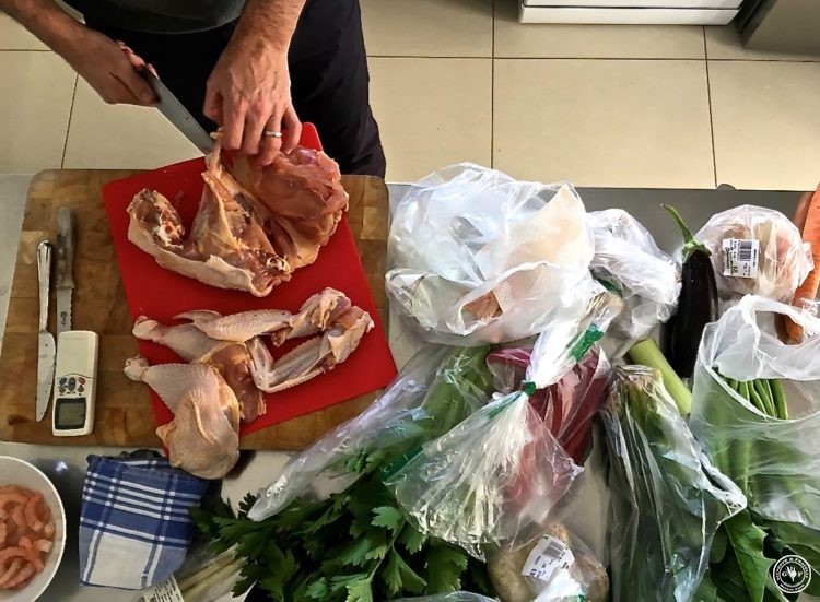 Für eine gute asiatische Hühnersuppe benötigt man ein schönes Freilandhühnchen vom Bauern eures Vertrauens. Ich trenne die Schenkel und Flügel ab, damit auch die Knochen freiliegen, und wir wirklich alle Aromen aus dem Hühnchen in die Suppe bekommen. Mein Kumpel Sternekoch Helmut Feuerlein hat hier einige tolle Tipps: So zum Beispiel kein Salz in die Brühe geben, denn das konserviert den Geschmack des Hühnchen im Fleisch – wir aber wollen den ganzen Geschmack in der Brühe.