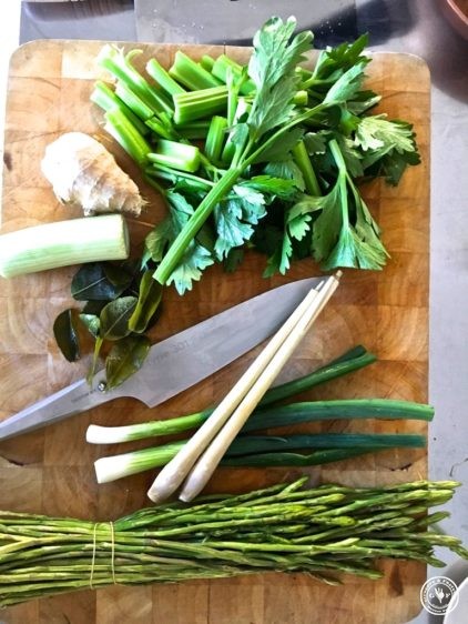 Jetzt bereiten wir die weiteren Zutaten der Suppe zu, die später zusammen mit der Karkasse in die Brühe kommen: Wir nehmen ein großes Stück Ingwer mit Schale, 5 Stangensellerie mit Grün, 1 Stück Lauch, 1 Karotte, 2 Zitronengras-Stangen, 6 Kaffirblätter (eingefroren aus dem Asia Laden) und 2 Frühlingszwiebeln.