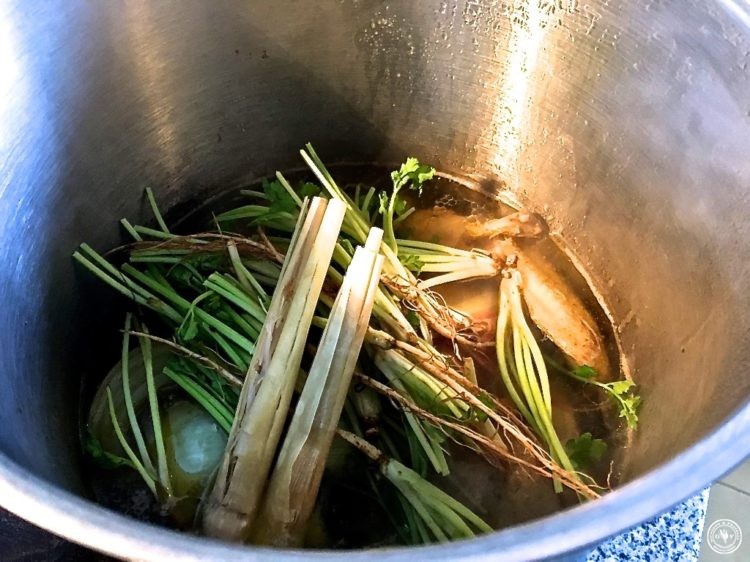 Nach 1.5 Stunden kommen die obigen Suppenzutaten, darunter das angedrückte Zitronengras (zuvor mit dem Messerrücken hämmern damit es schön das Aroma abgibt) sowie Korianderwurzeln von einem Bund frischem Koriander (gibt es ebenfalls im Asia-Laden, die Blätter nehmen wir später zum Garnieren) in die Brühe, dann die Karkasse dazu geben.