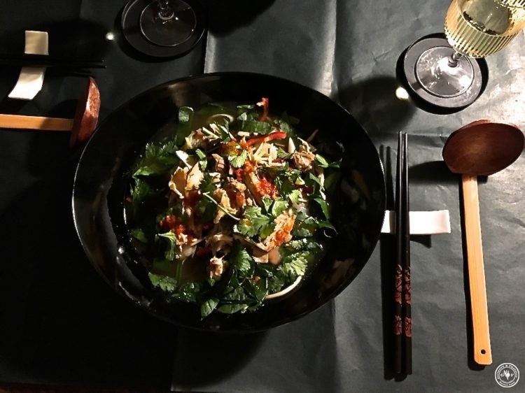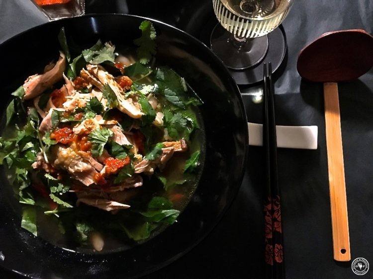 Mit der kochenden Brühe übergießen und mit einigen gezupften Korianderblättern dekorieren. Ganz am Schluss noch etwas selbstgemachtes Chilimus drauf (Chili und Olivenöl aufmixen) und fertig ist der Wintertraum. Die Mischung aus vietnamesisch, chinesisch und japanisch nennt man dann wohl Asian Fusion. Bon Appetit wie der Franzose sagt. Giuseppina, Asiatische Hühnersuppe: die Weltmeistersuppe ist fertig und dir Helmut danke für deine tollen Tipps!