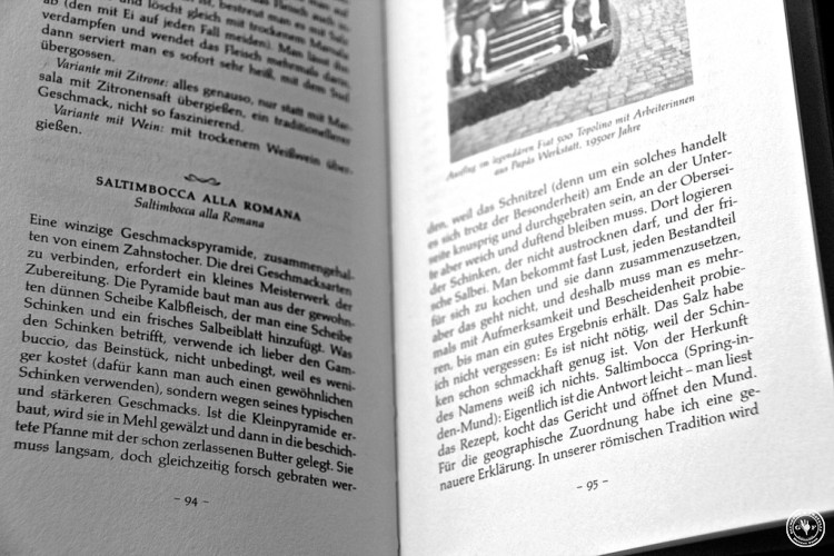 Kaum öffnet man das Büchlein, so scheint es sofort heraus zu dampfen und zu kochen, zwischen den Zeilen steigt Essensduft aus Kesseln und großen Familientöpfen. Man wird Zeuge eines Schwätzchens beim Gemüseschnibbeln oder besucht eine alteingesessene römische Bar, man hört es blubbern beim einkochen, brutzeln beim backen und braten und lachen beim feiern – so lebhaft und nah am Leben beschreibt Valabrega seine Kindheitserinnerungen und verbindet sie mit den einfachen und traditionsreichen Rezepten seiner Familie. Erinnerungen vermischen sich mit der Zutatenliste, in Gramm oder Kilo muss dabei nicht abgewogen werden. Der Freigeist belässt es bei einigen Handvoll, einem Bund Kräutern, den größeren unter den Casalino-Tomaten und gerade genug Flüssigkeit, so dass alles verdampfen kann…