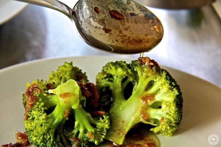 Die Brokkoli-Röschen gar dämpfen, mit der Sauce beträufeln und zum Schluss mit in Streifen geschnittener frischer Minze garnieren.