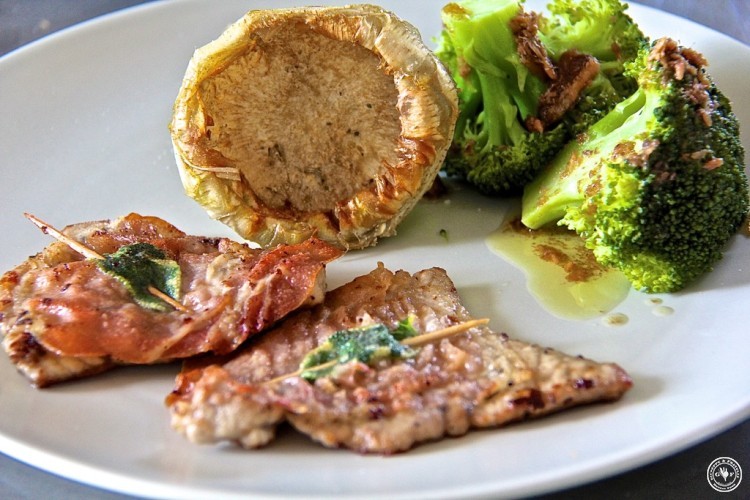 Beginnen wir mit dem Saltimbocca, oder wie Valabrega schreibt: „Eine winzige Geschmackspyramide, zusammengehalten von einem Zahnstocher. Die drei Geschmacksarten zu verbinden, erfordert ein kleines Meisterwerk der Zubereitung.“