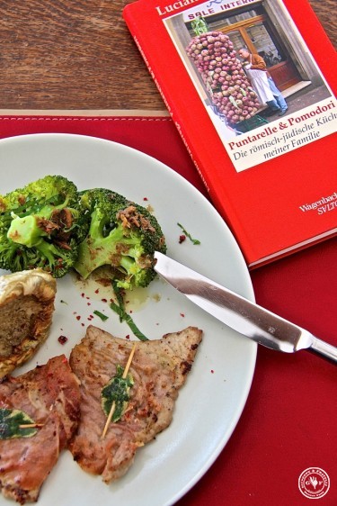 Uns läuft das Wasser im Mund zusammen und wir bekommen sofort Lust, etwas nachzukochen. Flugs die Kalbsschnitzel bei unserem Metzger des Vertrauens geholt und los geht’s. Heute gibt es Saltimbocca alla Romana (Seite 93) mit frittierten Artischocken und Brokkoli in Sardellensugo:
