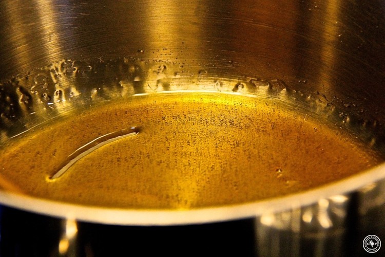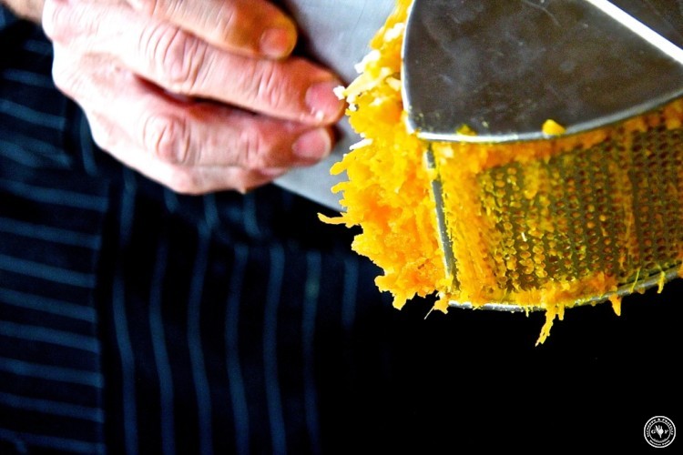 Nun widmen wir uns der Orangensauce. Zunächst die Schale einer Bio-Orange mit einem Sparschäler abschälen und in kleine Stifte schneiden. 60g Zucker mit 20 ml Wasser auf ganz kleiner Stufe des Herdes in einem Topf karamellisieren. Der Fachmann sagt, dass eine optimale Emulsion mit dem Orangensaft bei einer Temperatur von 166 Grad entsteht. Entweder hat man ein Infrarot-Thermometer oder man muss es machen wie die Profis: Probieren geht über studieren. Solange das angehende Karamel rühren bis es eine schöne Farbe hat und dann den gefilterten frischen Orangensaft langsam zugießen. Aber Achtung, da treffen völlig unterschiedlich Temperaturen aufeinander. Falls es spritzen sollte kann das ganz schöne Verbrennungen geben. Also vorsichtig sein. Die Orangenschalen-Stifte in die Sauce geben und 1 min aufkochen lassen. 20 ml Wasser mit 10g Stärke vermischen und die Sauce damit eindicken.