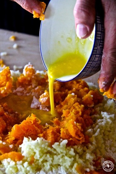 Sobald die Kartoffeln und der Kürbis fertig sind, noch heiß durch eine Kartoffelpresse drücken, (Spätzle-Schwob geht auch). Mit Salz, Pfeffer und geriebenem Muskat würzen, das Ei hinzugeben, und mit einer Spachtel alles gut miteinander vermengen. Den Teig mit den Händen durchkneten und gegebenenfalls nochmals Mehl zugehen. Ich beginne mit 200g Mehl, denn bei den Kartoffeln ist das immer so eine Sache. Manchmal benötigt man etwas weniger oder eben mehr Mehl als angegeben. Solange mit dem Mehl experimentieren, bis der Teig eine feste aber noch leichte Konsistenz hat. Den Teig mit einem Tuch zugedeckt 15 min ruhen lassen.