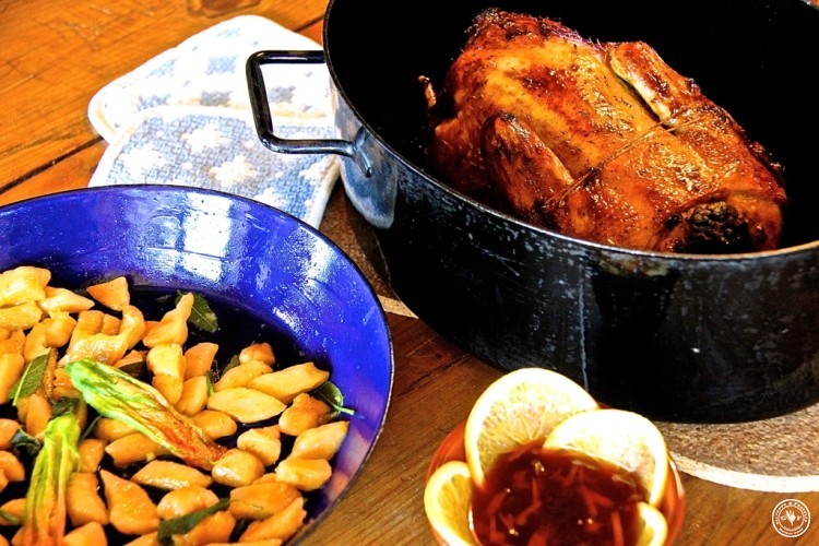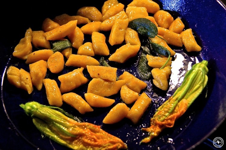 Da es ja gerade Kürbis an jedem Straßenrand zu erwerben gibt, will ich heute Kürbis-Gnocchi in Salbeibutter mit gebratenen Zucchiniblüten dazu machen. Wieder ein Klassiker, doch die leicht bittere Note der Orangensauce zusammen mit der Süße des Kürbis und dem unverwechselbaren Salbeigeschmack ergeben eine perfekte Kombination.
