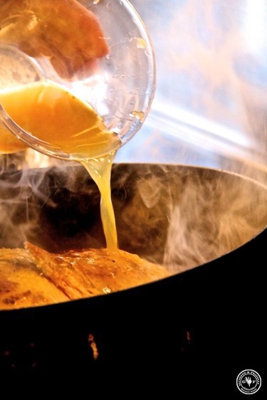 Nach 40 min die Ente aus dem Ofen nehmen, mit der Orangensauce von beiden Seiten einpinseln und für weitere 15 Minuten in den Ofen geben (Hitze auf 170 Grad reduzieren).