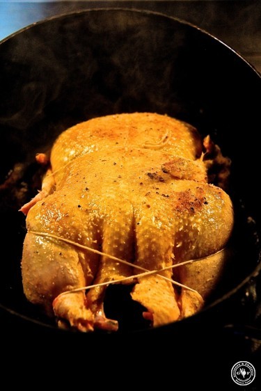 Die Ente von innen und aussen mit Pfeffer und Salz gut würzen, 2 Lorbeerblätter in die Bauchhöhle geben und mit Küchengarn gut verschnüren.