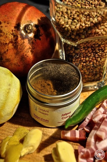 anschließend 2 Tl Jaipur Curry (ich glaube ich muss das doch noch ins Programm nehmen – kommt direkt aus Indien und ist eine Granate) und – apropos -einen Granatapfel.