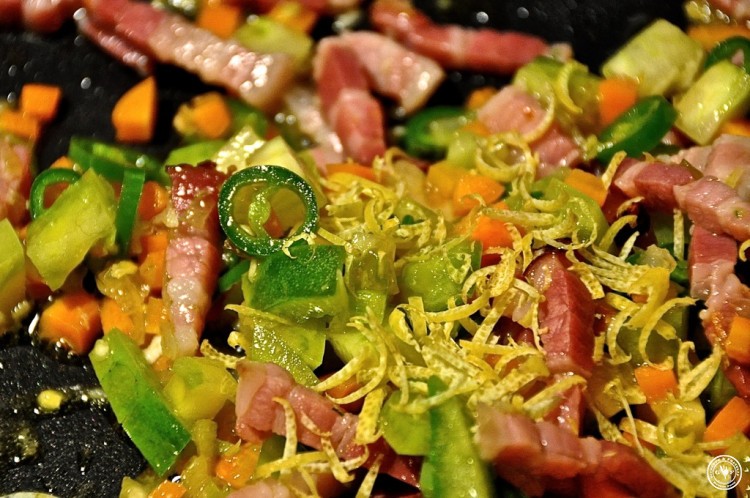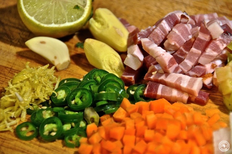 Für die Linsen verwenden wir: 1/2 Zwiebel in Würfel geschnitten, 1 Karotte in Würfeln, 2 Scheiben geräucherten Bauchspeck in feinen Streifen, die Zeste einer halben Zitrone in Streifen, 1 grüne Chili, 1 Knoblauchzehe, 1 grüne Tomate in Würfeln und 2 daumengroße Stücke Ingwer,