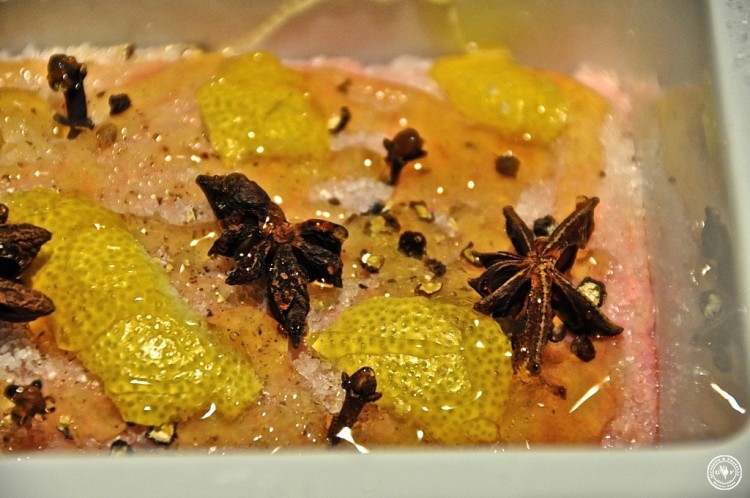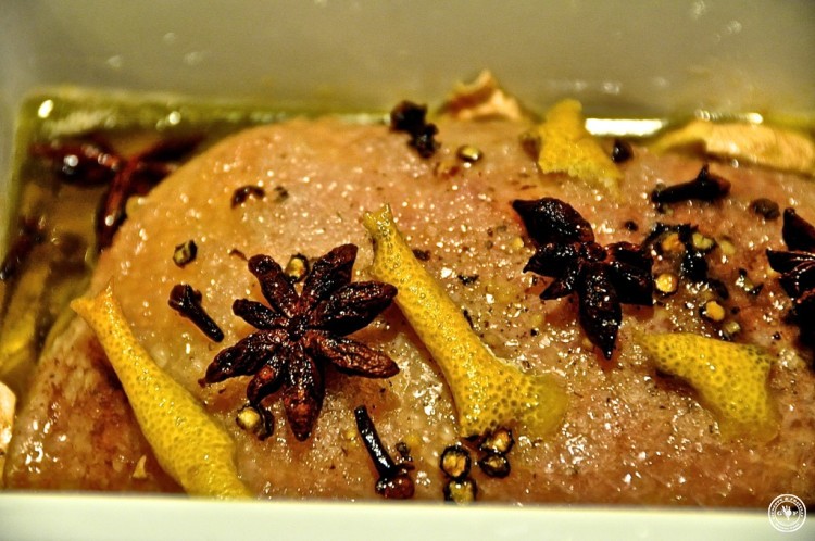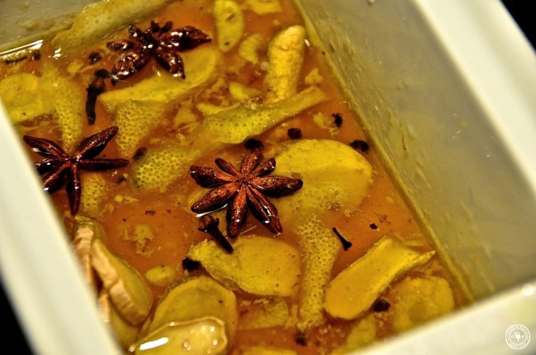 mit Ingwer, Sternanis, Nelken, Salz & Pfeffer gewürzt, mit ein wenig Honig versüßt und mit etwas Olivenöl angegossen. Dann den Deckel geschlossen und ab ins Kühlfach, um alles einige Stunden einziehen zu lassen.