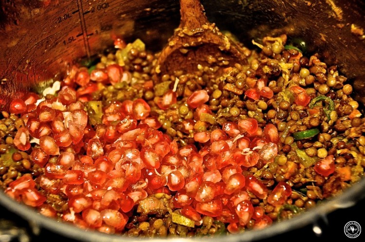 Inzwischen sind die Linsen fertig. Abgießen und mit dem Aromamix vermischen. Das Curry darauf, einen Spritzer Limettensaft, frisches Koriandergrün und Minze kleinhacken und rein damit. Zur Krönung den Granatapfel halbieren und mit einer Schöpfkelle die Samen aus dem Apfel schlagen – so ist das kinderleicht. Alles unterheben.