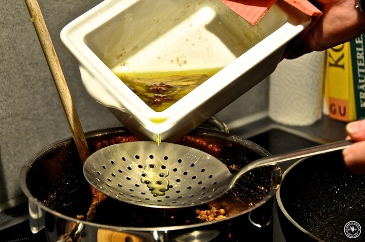 Den Fond der Ente siebe ich durch eine Schaumkelle und gebe diesen zu den Linsen. Der Fond ist herrlich aromatisch und gibt genügend Salz an die Aromalinsen ab.