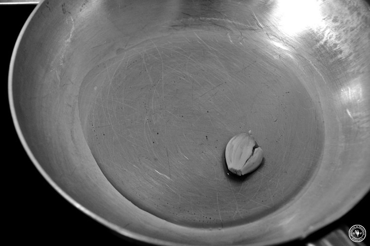 In einer Pfanne Olivenöl und eine gecrashte Knoblauchzehe bei mittlerer Hitze auslassen,
