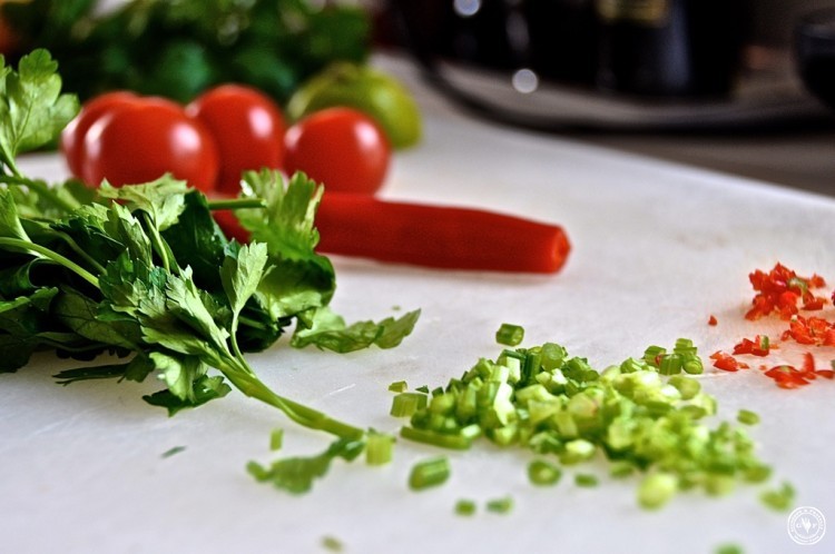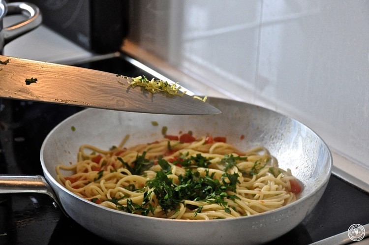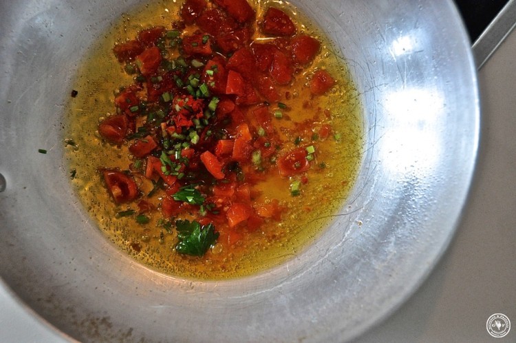 anschließend entfernen, 3 geschälte Kirschtomaten in Würfel schneiden (kurz zuvor im Nudelwasser blanchieren und die Haut abziehen), etwas frische Chili und einige kleingeschnittene Petersilienstängel hinzu…
