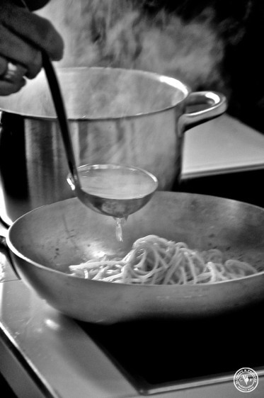 2 Kellen vom gesalzenen Nudelwasser angießen (erspart übrigens das Salzen der Sauce),