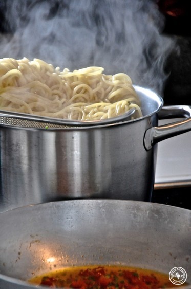 Wir nehmen heute die Gragnano Spaghetti von Gentile. Eine IGP Nudel aus der Region Neapels. Genau wie die Maccheroncini aus Campofilone. Die einzigen IGP-Nudeln in ganz Italien.