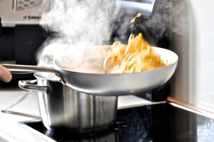 Die Spaghetti 6 Minuten in Salzwasser aldenten und tropfnass in die Pfanne geben.