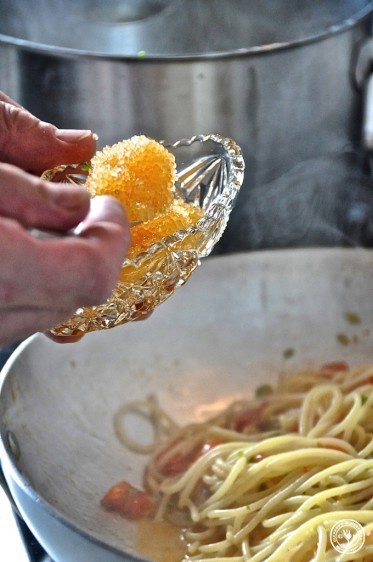 Die Nudeln saugen die Sauce durstig auf. Ganz zum Schluss den Rogen dazugeben und kurz unterheben.