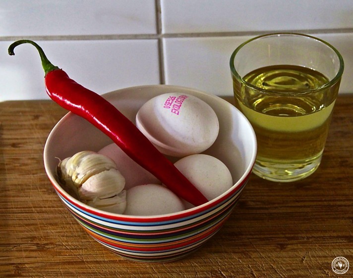 1) Die gehackte Knoblauchzehe und die gehackte Pepperoni in ein Gefäß geben.