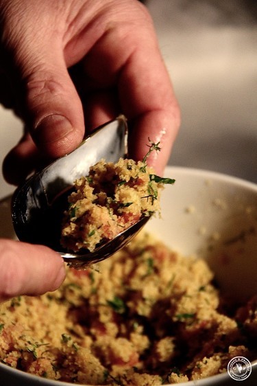 Alle Zutaten in eine Schüssel geben, die Kräuter klein hacken, den Muschelsud hinzu und alles vermischen. Dann in die Muschelhälfte füllen…