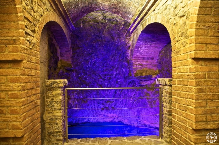 Mirella und Mauro führen uns in die beeindruckende Kellerei, die mit viel Achtsamkeit und Liebe zum Detail aufgebaut und renoviert wurde. Die mächtigen Holzfässer ruhen still unter riesigen Gewölbebögen, eine Quelle sprudelt am Ende eines Regalgangs aus unbekannter Tiefe hervor und wird in ein wechselndes Farbbad getaucht. Sagenhaft!