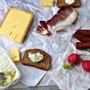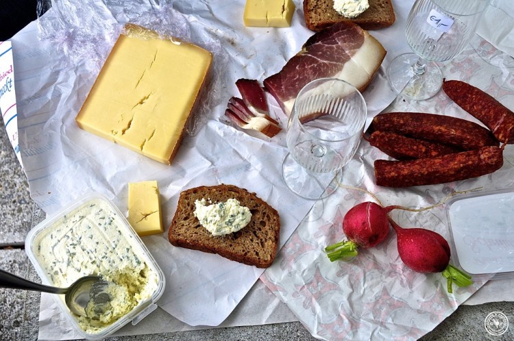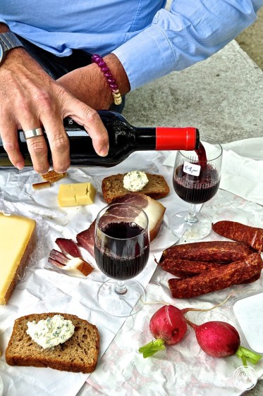 Genau hier! Und Giuseppe beginnt zu arrangieren und alles mit schwingendem Sackmesser in Scheiben zu zerlegen: Bergkäse, Schinken, knackig-pikante Radieschen, Landjäger, Reinis hausgemachter Schnittlauchaufstrich und sein phantastisches, saftig-schweres Dinkelbrot. Dazu ein gutes Glas Rotwein. Liebe Nachbarn: Ihr könnt’s auch!!