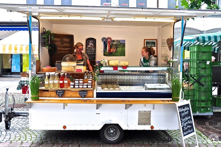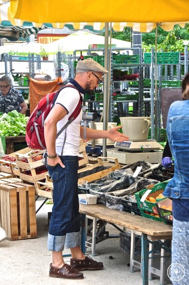 Der Wochenmarkt von Bregenz ist toll. Klein, fein und heiter. Giuseppes Sackmesser eingepackt, denn wir haben vor, uns dort mit lokalen Köstlichkeiten einzudecken und ein mittägliches Stadtpicknick am Ufer des Bodensees abzuhalten. Aber zuvor ist unbedingt noch ein zweiter Kaffee am Morgen beim Kunsthaus fällig.