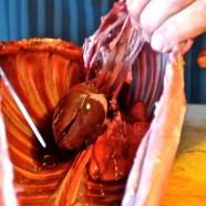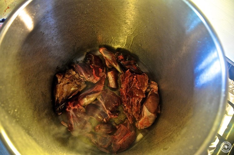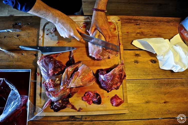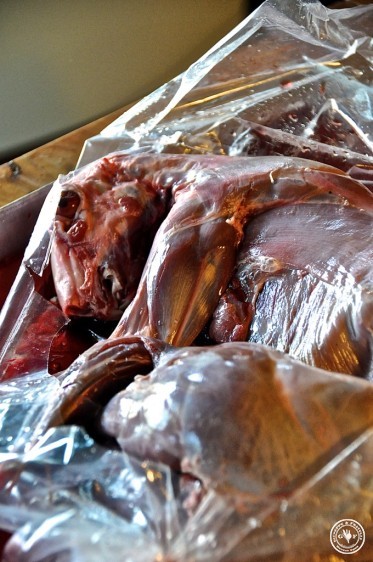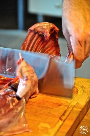 Ich bin ganz aufgeregt, denn wir machen heute für die Weihnachtszeit Geschenke. Aber zerteilen ist angesagt. Das ist nicht so einfach sag ich euch! Trotzdem möchte ich anfügen, dass die folgenden Bilder nicht für Weicheier sind und vor allem auch das wahre Leben widerspiegeln: wer gut essen will, muss auch wissen woher das alles kommt. So come in and find out! Man sieht wie mir zumute ist: beim ersten Mal tut`s echt autsch! Man erkennt’s an der Stirnfalte, oder?
