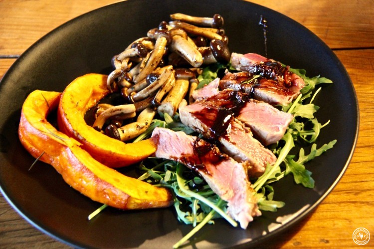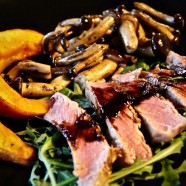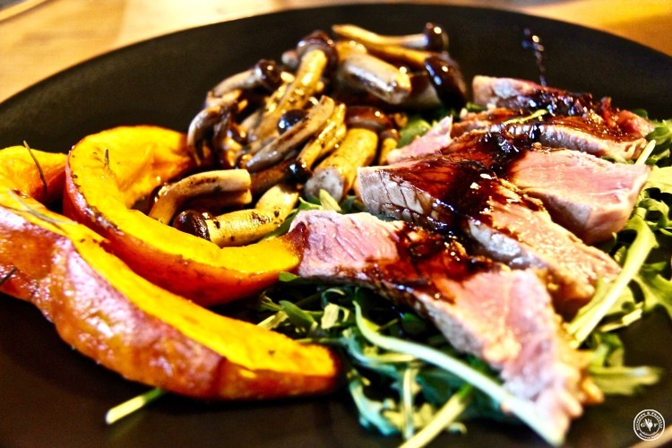 2. Gang: Kalbssteak auf Rucola, Balsamico-Reduktion, Ofenkürbis und Braunkappen-Pilze.