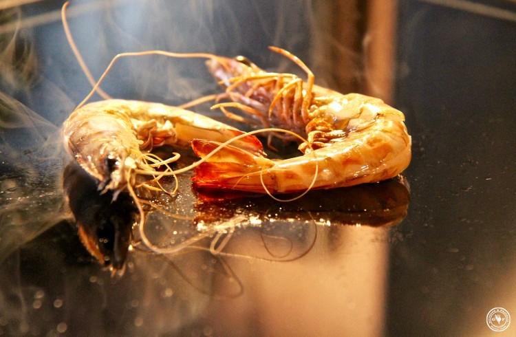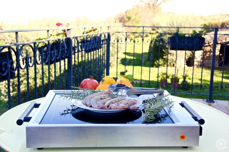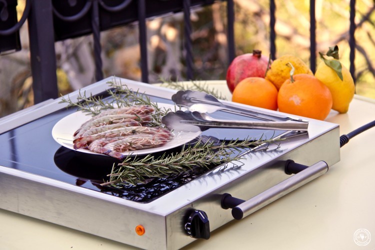 Der LeMax heizt sich auf. Auf der glatten Keramikoberfläche wird nix haften bleiben und das Gute daran: keine Pfannen spülen. Zudem hat er eine große Fläche, auf der an jeder Stelle des Quadrats die gleiche Temperatur herrscht. Also kann man sehr viel zur gleichen Zeit grillen und hat somit den ersten Gang ruck zuck auf dem Tisch! Fangen wir erst einmal mit 2 Garnelen zur Probe an: