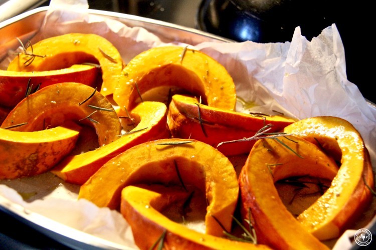 Den Hokkaidokürbis hab‘ ich in Spalten geschnitten, mit Olivenöl beträufelt und mit etwas Lavendelsalz gewürzt. Bei 180 Grad im Ofen circa 15min garen. Wäre auch was für den LeMax gewesen, aber nicht alles auf einmal.