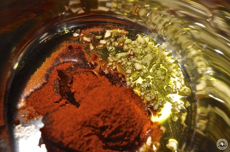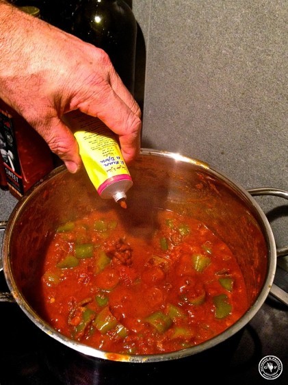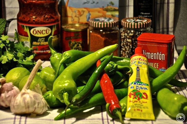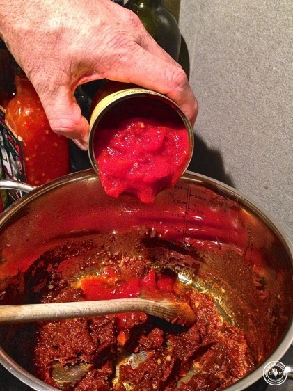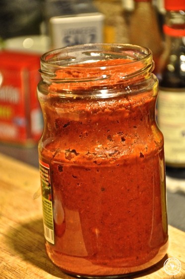 1 Knoblauchzehe, 1Tl Paprika edelsüß, 1 El Tomatenmark, etwas Salz und 1/2 Tl Harissa würzen und mit einer Dose gestückelte Tomaten und einer 1/2 Dose Wasser alles zusammen eine 1/2 Stunde köcheln lassen.